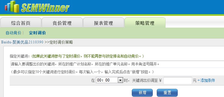 EMARBOX系統(tǒng)策略管理--定時調(diào)價模塊,根據(jù)聚美歷史積累的關(guān)鍵詞預(yù)算、時間段、ROI的整體分析,對聚美投放的特定關(guān)鍵詞進(jìn)行智能自動調(diào)價,擴大投資回報率。