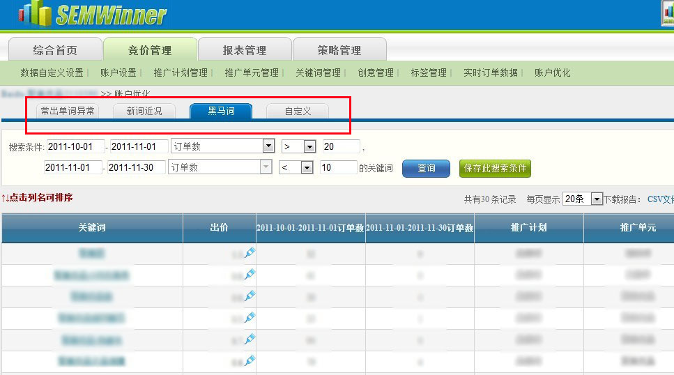 EMARBOX系統(tǒng)競價管理--賬戶優(yōu)化模塊提供聚美優(yōu)品“常出單詞異常”、“新詞近況”、“黑馬詞推薦”、“自定義”篩選功能,為聚美優(yōu)品全方位的分析投放關(guān)鍵詞;準(zhǔn)確、高效實時監(jiān)控;并為聚美減少了大量人力監(jiān)控成本。