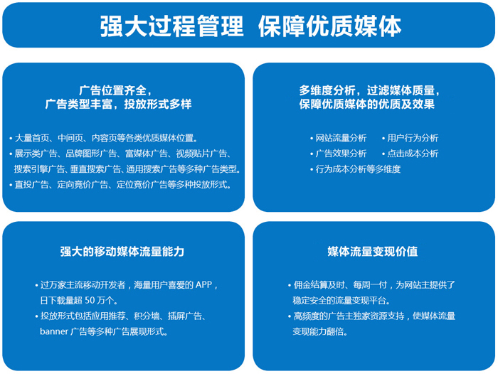 億瑪憑借強(qiáng)大媒體覆蓋能力,運(yùn)用多種手段保證媒體質(zhì)量及投放效果,一方面為媒體實(shí)現(xiàn)流量變現(xiàn),另一方面為廣告主實(shí)現(xiàn)廣告價(jià)值。